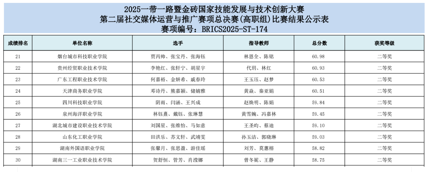 2025年11月27日,2025一带一路暨金砖国家技能发展与技术创新大赛第二届社交媒体运营与推广赛项总决赛(高职组)圆满落幕。四川科技职业学院数字商务学院赵焕明、陈娟两位老师指导的参赛队伍,在全国众多高校团队的激烈角逐中脱颖而出,荣获国家级二等奖!
