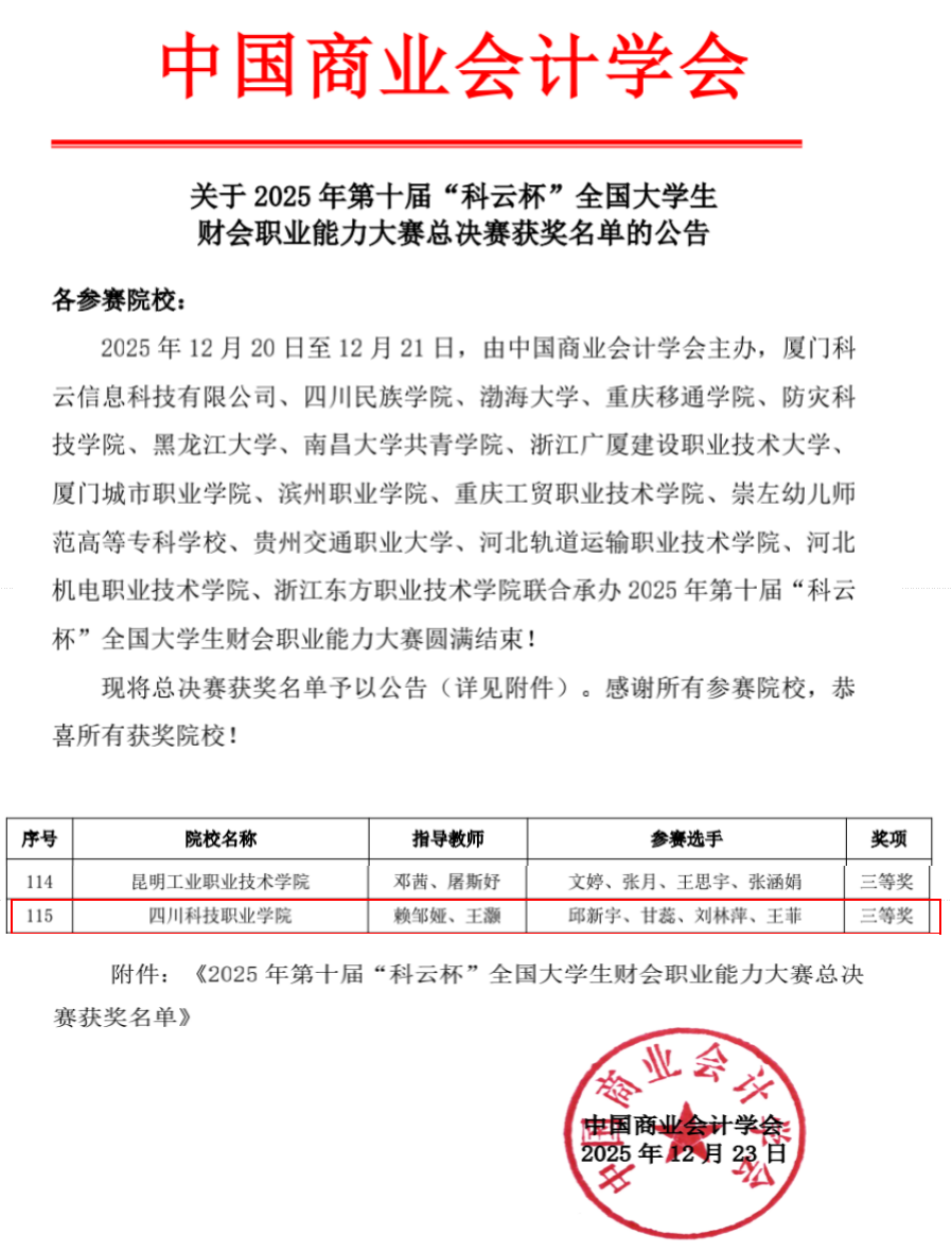 近日,2025年第十届“科云杯”全国大学生财会职业能力大赛高职组赛事落下帷幕。四川科技职业学院数字商务学院两支参赛队伍历经省赛、国赛层层角逐,斩获省级一等奖1项、省级三等奖1项,其中省级一等奖队伍晋级全国总决赛,再获国赛三等奖,充分展现了学院财会专业人才培养的扎实成效。