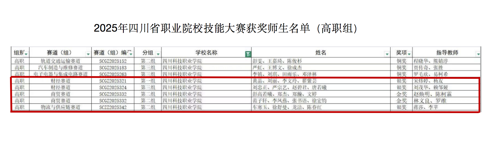 近期,2025年四川省职业院校技能大赛(高职组)圆满落幕。在全省高职院校同台竞技、激烈角逐的赛场上,四川科技职业学院数字商务学院参赛团队捷报频传,在商贸赛道斩获2项金奖,在财经赛道和物流与供应链赛道共斩获3项银奖,以亮眼战绩跻身全省同类院校第一方阵,充分彰显了学院在数字商务领域的人才培养实力与专业建设成效。