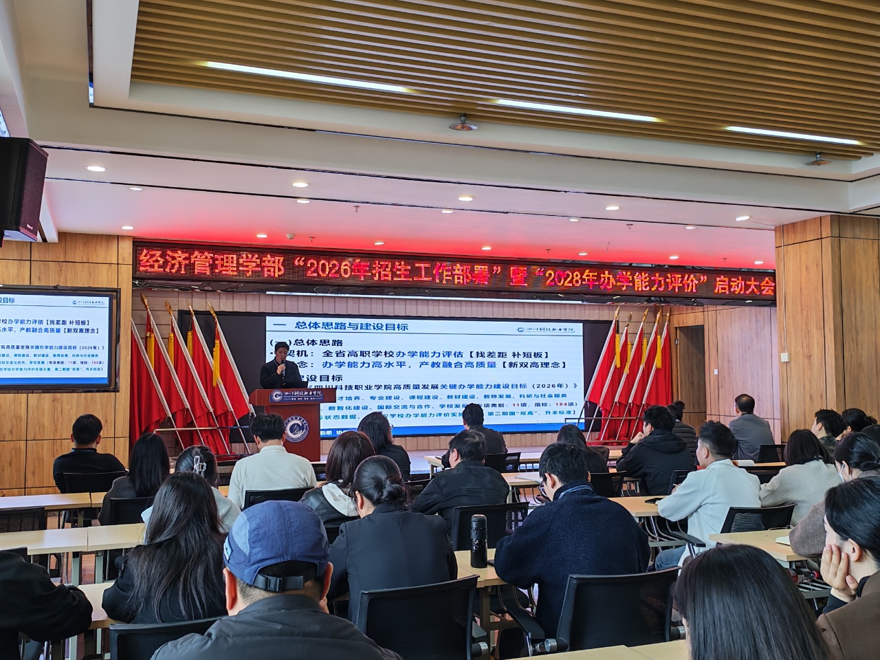 会上,学校内涵办副主任余海率先对学校2026年办学能力建设整体框架、高质量发展关键目标及教学工作要点进行系统解读,明确了学部现阶段发展的核心方向与工作重点,为后续各项工作开展提供了清晰指引。随后,程冲、李宝苏、何浦三位院长依次结合各自专业特点作交流发言,围绕专业建设、人才培养、产教融合等重点工作阐述具体举措。大家一致表示,将以2028年办学能力评估为重要契机,深化产教融合与校企协同育人,推动人才培养模式与市场产业需求精准对接、同频共振,持续提升专业建设水平与人才培养质量。